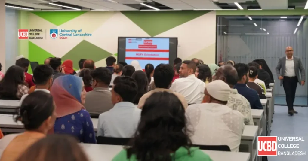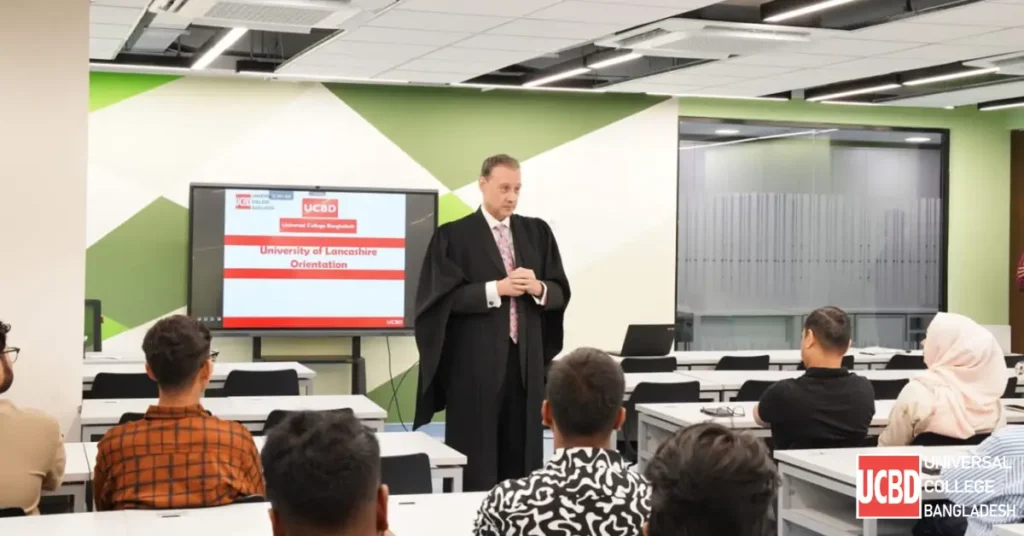 English Article: Universal College Bangladesh (UCBD) has welcomed the second batch of students enrolling in international business and information technology degree programmes offered by the University of Lancashire (ULan). The orientation, held on September 28 at UCBD’s Gulshan campus, introduced freshers and their parents to university life and the UK-accredited degrees available in Dhaka. “UCBD, the exclusive partner of ULan in Bangladesh, is the first higher education institution in the country to receive Ministry of Education approval to offer full international degrees. Students can complete their three-year honours programme in Dhaka or transfer to the UK after the first year”, says a press release. The event opened with remarks from Professor Muhammad Ismail Hossain, Dean of Academic Affairs, and Professor Hew Gill, President and Provost of UCBD. Addressing the students, Professor Gill said, “This is an excellent opportunity for local students to learn from our internationally acclaimed faculty members. The degrees offered here in Dhaka are exactly the same as those in the UK. In three years’ time, I look forward to presenting every student with a certificate proudly stating they have a degree from the University of Lancashire.” Ambreen Zaman, IT Programme Coordinator at UCBD, stressed the institution’s holistic approach, saying, “University isn’t just about academics; it’s about developing the whole person. This orientation introduces students and parents to the many resources available to help them thrive not only in their studies but also in life.” A Parents’ Orientation, led by Professor Gill and Samia Salam, Parent Engagement and Event Coordinator, was a key highlight. The session explained how ULan degrees open doors to career opportunities and postgraduate study. Programme-specific sessions followed, including presentations by UK faculty members involved in teaching and examining the ULan degrees in Bangladesh. Students were briefed on academic policies, expectations, support services, and campus life. A networking break midway through the day gave students, parents, faculty, and staff a chance to connect. The event closed with contributions from UCBD faculty and coordinators, reinforcing the college’s mission to build a well-informed, engaged, and supportive academic community from the outset of the year. Bangla Article: ইউনিভার্সিটি অব ল্যাঙ্কাশায়ারের (ইউএলএএন) ইন্টারন্যাশনাল বিজনেস ও ইনফরমেশন টেকনোলজি প্রোগ্রামে দ্বিতীয় ব্যাচের শিক্ষার্থীদের ওরিয়েন্টেশন অনুষ্ঠান আয়োজন করেছিল ইউনিভার্সাল কলেজ বাংলাদেশ (ইউসিবিডি)। গত রোববার (২৮ সেপ্টেম্বর) ইউসিবিডির গুলশান ক্যাম্পাসে এক অনুষ্ঠানে নবীন শিক্ষার্থী ও তাঁদের অভিভাবকদের স্বাগত জানানো হয়। অনুষ্ঠানে তাঁদের বিশ্ববিদ্যালয়ের শিক্ষাজীবন ও ইউসিবিডিতে যুক্তরাজ্যের ডিগ্রি সম্পর্কে সামগ্রিক ধারণা দেওয়া হয়। ইউএলএএন প্রোগ্রামের শিক্ষার্থীরা চাইলে ঢাকায় তিন বছরেই অনার্স সম্পন্ন করতে পারবেন কিংবা প্রথম বর্ষ শেষে তাদের জন্য যুক্তরাজ্যে স্থানান্তরের সুযোগও রয়েছে। অনুষ্ঠানের শুরুতে অতিথি ও শিক্ষার্থীদের উষ্ণ অভ্যর্থনা জানান ও উদ্বোধনী বক্তব্য দেন ইউসিবিডির ডিন অব একাডেমিক অ্যাফেয়ার্স অধ্যাপক মোহাম্মদ ইসমাইল হোসেন এবং ইউসিবিডির প্রেসিডেন্ট ও প্রভোস্ট অধ্যাপক হিউ গিল। শিক্ষার্থীরা ওরিয়েন্টেশনের অংশ হিসেবে ডিগ্রি-ভিত্তিক সেশনগুলোতে অংশ নেন, যেখানে প্রতিটি ডিগ্রি নিয়ে আলোচনা করা হয়। এসব সেশনে শিক্ষার্থীদের জন্য যুক্তরাজ্যের ফ্যাকাল্টি মেম্বাররা প্রেজেন্টেশন দেন। এই ফ্যাকাল্টি মেম্বাররা বাংলাদেশে ইউএলএএন ডিগ্রির অধীনে শিক্ষাদান ও মূল্যায়ন প্রক্রিয়ার সঙ্গেও সম্পৃক্ত। ওরিয়েন্টেশন প্রোগ্রামে শিক্ষার্থীরা একই সঙ্গে গুরুত্বপূর্ণ বিভিন্ন পলিসি, একাডেমিক প্রত্যাশা, শিক্ষার্থী সহায়তা সেবা এবং ক্যাম্পাস জীবন সম্পর্কেও জানার সুযোগ পান। Published In: TheDailyStar, Prothomalo, Tbsnews, Dhakamail, Thedhakatimes, Sangbadprotidin24, Protidinersangbad, Lekha
