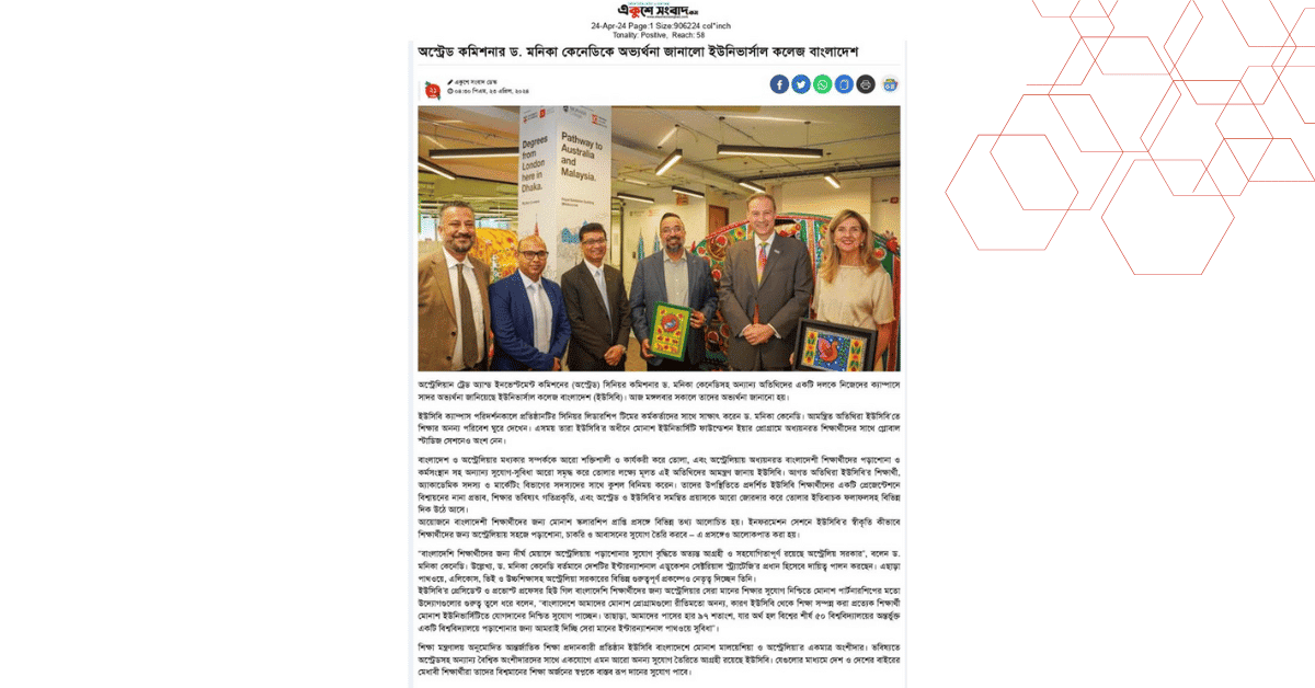 অস্ট্রেলিয়ান ট্রেড অ্যান্ড ইনভেস্টমেন্ট কমিশনের (অস্ট্রেড) সিনিয়র কমিশনার ড. মনিকা কেনেডিসহ অন্যান্য অতিথিদের একটি দলকে নিজেদের ক্যাম্পাসে সাদর অভ্যর্থনা জানিয়েছে ইউনিভার্সাল কলেজ বাংলাদেশ (ইউসিবি)। আজ মঙ্গলবার সকালে তাদের অভ্যর্থনা জানানো হয়।
