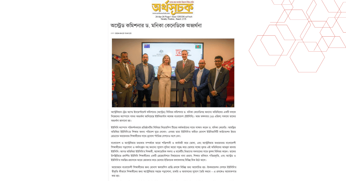 অস্ট্রেলিয়ান ট্রেড অ্যান্ড ইনভেস্টমেন্ট কমিশনের (অস্ট্রেড) সিনিয়র কমিশনার ড. মনিকা কেনেডিসহ অন্যান্য অতিথিদের একটি দলকে নিজেদের ক্যাম্পাসে সাদর অভ্যর্থনা জানিয়েছে ইউনিভার্সাল কলেজ বাংলাদেশ (ইউসিবি)। আজ মঙ্গলবার (২৩ এপ্রিল) সকালে তাদের অভ্যর্থনা জানানো হয়।