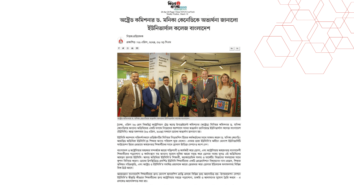 অস্ট্রেলিয়ান ট্রেড অ্যান্ড ইনভেস্টমেন্ট কমিশনের (অস্ট্রেড) সিনিয়র কমিশনার ড. মনিকা কেনেডিসহ অন্যান্য অতিথিদের একটি দলকে নিজেদের ক্যাম্পাসে সাদর অভ্যর্থনা জানিয়েছে ইউনিভার্সাল কলেজ বাংলাদেশ (ইউসিবি)। আজ মঙ্গলবার (২৩ এপ্রিল, ২০২৪) সকালে তাদের অভ্যর্থনা জানানো হয়।