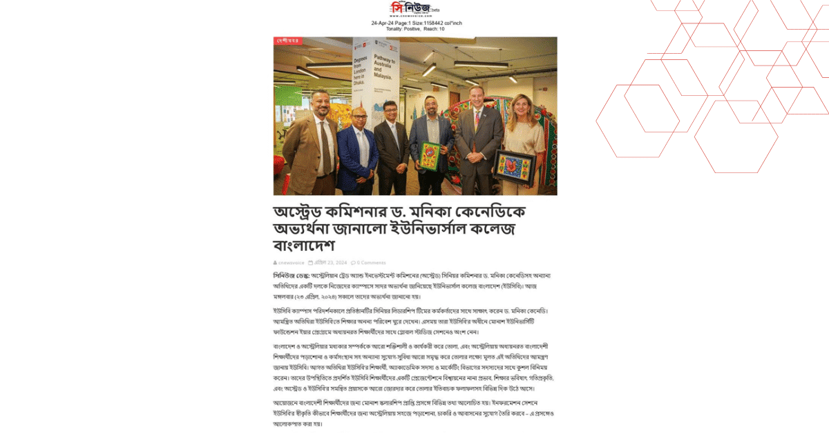 অস্ট্রেলিয়ান ট্রেড অ্যান্ড ইনভেস্টমেন্ট কমিশনের (অস্ট্রেড) সিনিয়র কমিশনার ড. মনিকা কেনেডিসহ অন্যান্য অতিথিদের একটি দলকে নিজেদের ক্যাম্পাসে সাদর অভ্যর্থনা জানিয়েছে ইউনিভার্সাল কলেজ বাংলাদেশ (ইউসিবি)। আজ মঙ্গলবার (২৩ এপ্রিল, ২০২৪) সকালে তাদের অভ্যর্থনা জানানো হয়।