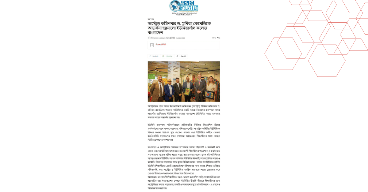 অস্ট্রেলিয়ান ট্রেড অ্যান্ড ইনভেস্টমেন্ট কমিশনের (অস্ট্রেড) সিনিয়র কমিশনার ড. মনিকা কেনেডিসহ অন্যান্য অতিথিদের একটি দলকে নিজেদের ক্যাম্পাসে সাদর অভ্যর্থনা জানিয়েছে ইউনিভার্সাল কলেজ বাংলাদেশ (ইউসিবি)। আজ মঙ্গলবার সকালে তাদের অভ্যর্থনা জানানো হয়।