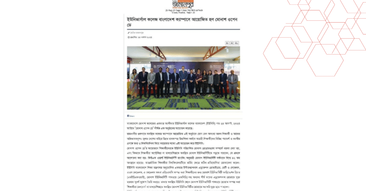 বাংলাদেশে মোনাশ কলেজের একমাত্র অংশীদার ইউনিভার্সাল কলেজ বাংলাদেশ (ইউসিবি) গত ২৪ আগস্ট, ২০২৩ তারিখে ‘মোনাশ ওপেন ডে’ শীর্ষক এক অনুষ্ঠানের আয়োজন করেছে।