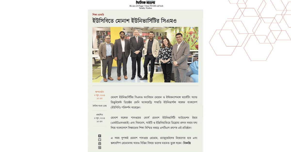 মোনাশ ইউনিভার্সিটির সিএমও ফ্যাবিয়ান মেরোন ও ইন্টারন্যাশনাল মার্কেটিং অ্যান্ড রিক্রুটমেন্ট ডিরেক্টর জেনি ম্যাকহেন্ড্রি সম্প্রতি ইউনিভার্সাল কলেজ বাংলাদেশ (ইউসিবি) পরিদর্শন করেছেন।