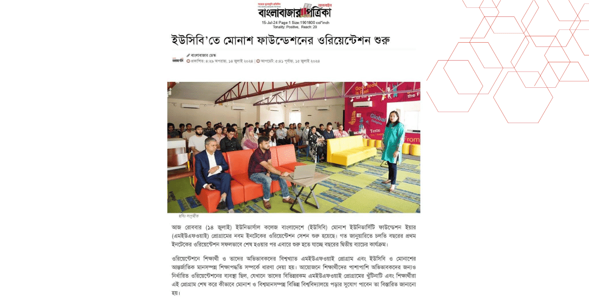 আজ রোববার (১৪ জুলাই) ইউনিভার্সাল কলেজ বাংলাদেশে (ইউসিবি) মোনাশ ইউনিভার্সিটি ফাউন্ডেশন ইয়ার (এমইউএফওয়াই) প্রোগ্রামের নবম ইনটেকের ওরিয়েন্টেশন সেশন শুরু হয়েছে। গত জানুয়ারিতে চলতি বছরের প্রথম ইনটেকের ওরিয়েন্টেশন সফলভাবে শেষ হওয়ার পর এবারে শুরু হতে যাচ্ছে বছরের দ্বিতীয় ব্যাচের কার্যক্রম।