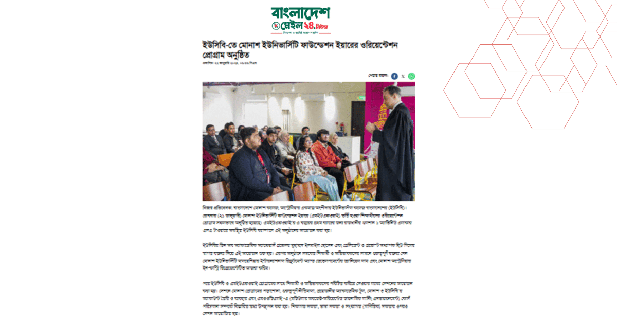 বাংলাদেশে মোনাশ কলেজ, অস্ট্রেলিয়ার একমাত্র অংশীদার ইউনিভার্সাল কলেজ বাংলাদেশের (ইউসিবি)। রোববার (২১ জানুয়ারি) মোনাশ ইউনিভার্সিটি ফাউন্ডেশন ইয়ারে (এমইউএফওয়াই) ভর্তি হওয়া শিক্ষার্থীদের ওরিয়েন্টেশন প্রোগ্রাম সফলভাবে অনুষ্ঠিত হয়েছে। এমইউএফওয়াই’র এ বছরের প্রথম ব্যাচের জন্য রাজধানীর গুলশান ১ অ্যাভিনিউ এলাকার এসএ টাওয়ারে অবস্থিত ইউসিবি ক্যাম্পাসে এই অনুষ্ঠানের আয়োজন করা হয়।