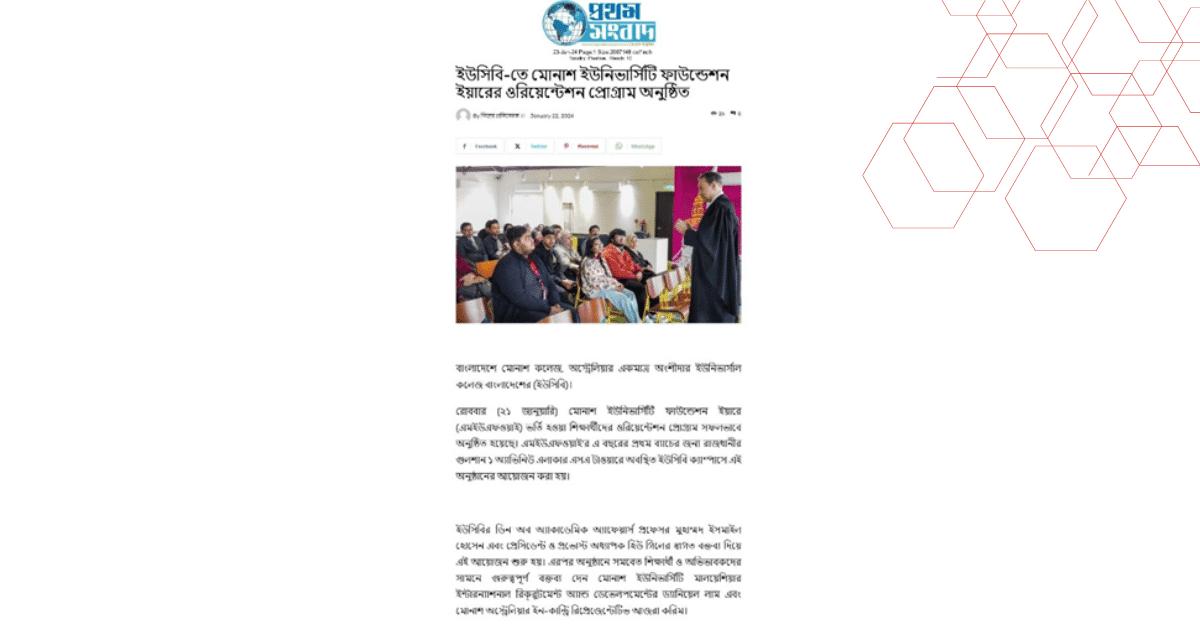 রোববার (২১ জানুয়ারি) মোনাশ ইউনিভার্সিটি ফাউন্ডেশন ইয়ারে (এমইউএফওয়াই) ভর্তি হওয়া শিক্ষার্থীদের ওরিয়েন্টেশন প্রোগ্রাম সফলভাবে অনুষ্ঠিত হয়েছে। এমইউএফওয়াই’র এ বছরের প্রথম ব্যাচের জন্য রাজধানীর গুলশান ১ অ্যাভিনিউ এলাকার এসএ টাওয়ারে অবস্থিত ইউসিবি ক্যাম্পাসে এই অনুষ্ঠানের আয়োজন করা হয়।