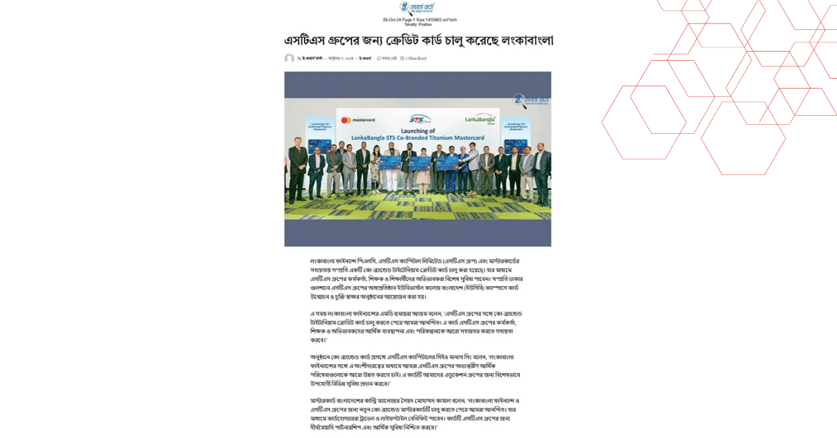 লংকাবাংলা ফাইন্যান্স পিএলসি, এসটিএস ক্যাপিটাল লিমিটেড (এসটিএস গ্রুপ) এবং মাস্টারকার্ডের সহায়তায় সম্প্রতি একটি কো-ব্র্যান্ডেড টাইটেনিয়াম ক্রেডিট কার্ড চালু করা হয়েছে। যার মাধ্যমে এসটিএস গ্রুপের কর্মকর্তা, শিক্ষক ও শিক্ষার্থীদের অভিভাবকরা বিশেষ সুবিধা পাবেন। সম্প্রতি ঢাকার গুলশানে এসটিএস গ্রুপের অঙ্গপ্রতিষ্ঠান ইউনিভার্সাল কলেজ বাংলাদেশ (ইউসিবি) ক্যাম্পাসে কার্ড উন্মোচন ও চুক্তি স্বাক্ষর অনুষ্ঠানের আয়োজন করা হয়।