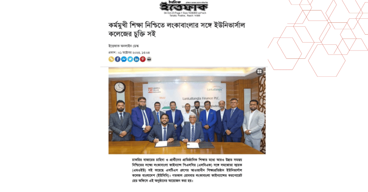 চাকরির বাজারের চাহিদা ও প্রার্থীদের প্রাতিষ্ঠানিক শিক্ষার মধ্যে আরও উন্নত সমন্বয় নিশ্চিতের লক্ষ্যে লংকাবাংলা ফাইন্যান্স পিএলসির (এলবিএফ) সঙ্গে সমঝোতা স্মারক (এমওইউ) সই করেছে এসটিএস গ্রুপের আওতাধীন শিক্ষাপ্রতিষ্ঠান ইউনিভার্সাল কলেজ বাংলাদেশ (ইউসিবি)। গতকাল রোববার লংকাবাংলা ফাইন্যান্সের করপোরেট হেড অফিসে এই অনুষ্ঠানের আয়োজন করা হয়।