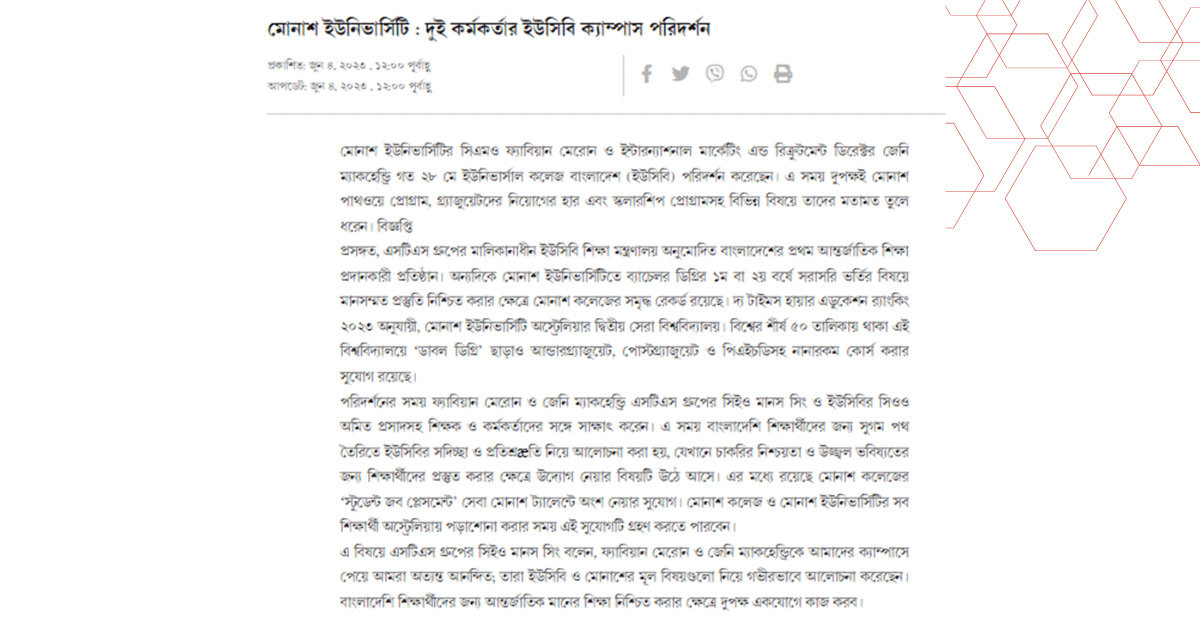 পরিদর্শনের সময় ফ্যাবিয়ান মেরোন ও জেনি ম্যাকহেন্ড্রি এসটিএস গ্রুপের সিইও মানস সিং ও ইউসিবির সিওও অমিত প্রসাদসহ শিক্ষক ও কর্মকর্তাদের সঙ্গে সাক্ষাৎ করেন। এ সময় বাংলাদেশি শিক্ষার্থীদের জন্য সুগম পথ তৈরিতে ইউসিবির সদিচ্ছা ও প্রতিশ্রæতি নিয়ে আলোচনা করা হয়, যেখানে চাকরির নিশ্চয়তা ও উজ্জ্বল ভবিষ্যতের জন্য শিক্ষার্থীদের প্রস্তুত করার ক্ষেত্রে উদ্যোগ নেয়ার বিষয়টি উঠে আসে। এর মধ্যে রয়েছে মোনাশ কলেজের ‘স্টুডেন্ট জব প্লেসমেন্ট’ সেবা মোনাশ ট্যালেন্টে অংশ নেয়ার সুযোগ। মোনাশ কলেজ ও মোনাশ ইউনিভার্সিটির সব শিক্ষার্থী অস্ট্রেলিয়ায় পড়াশোনা করার সময় এই সুযোগটি গ্রহণ করতে পারবেন।