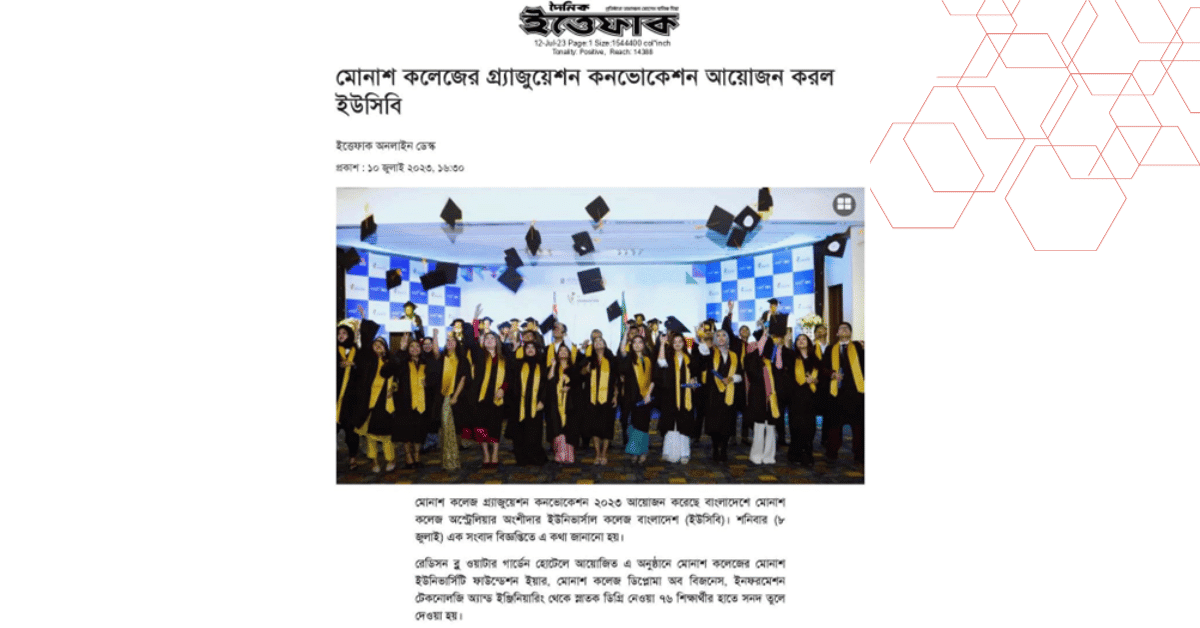 মোনাশ কলেজ গ্র্যাজুয়েশন কনভোকেশন ২০২৩ আয়োজন করেছে বাংলাদেশে মোনাশ কলেজ অস্ট্রেলিয়ার অংশীদার ইউনিভার্সাল কলেজ বাংলাদেশ (ইউসিবি)। শনিবার (৮ জুলাই) এক সংবাদ বিজ্ঞপ্তিতে এ কথা জানানো হয়।