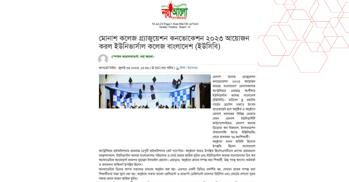 মোনাশ কলেজ গ্র্যাজুয়েশন কনভোকেশন ২০২৩ আয়োজন করেছে বাংলাদেশে মোনাশকলেজ অস্ট্রেলিয়ার একমাত্র অংশীদার ইউনিভার্সাল কলেজ বাংলাদেশ (ইউসিবি)। রাডিসন ব্লু ওয়াটার গার্ডেন হোটেল ঢাকা’র উৎসব ব্যাংকোয়েট হলে অনুষ্ঠিত এ অনুষ্ঠানে মোনাশ কলেজের বিভিন্ন প্রোগ্রাম যেমন মোনাশ ইউনিভার্সিটি ফাউন্ডেশনইয়ার, মোনাশ কলেজ ডিপ্লোমা অব বিজনেস, ইনফরমেশন টেকনোলজি অ্যান্ড ইঞ্জিনিয়ারিং থেকে স্নাতকহন ৭৬ জনশিক্ষার্থী।