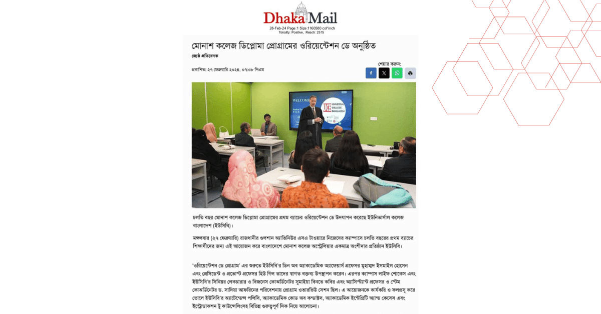 চলতি বছর মোনাশ কলেজ ডিপ্লোমা প্রোগ্রামের প্রথম ব্যাচের ওরিয়েন্টেশন ডে উদযাপন করেছে ইউনিভার্সাল কলেজ বাংলাদেশ (ইউসিবি)।