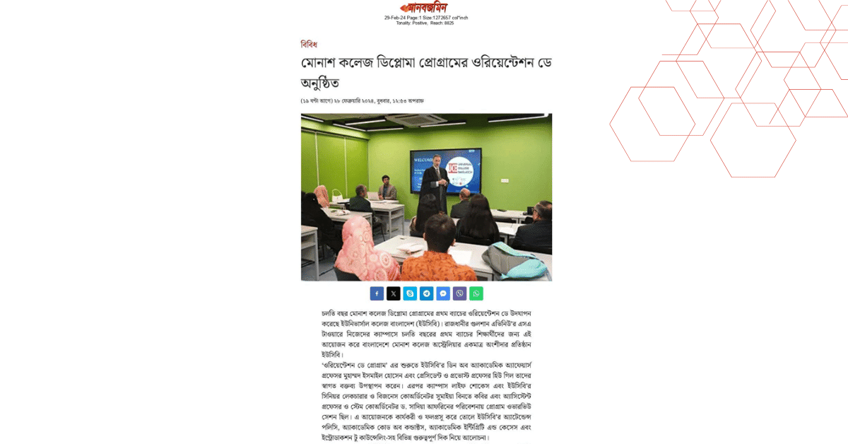 চলতি বছর মোনাশ কলেজ ডিপ্লোমা প্রোগ্রামের প্রথম ব্যাচের ওরিয়েন্টেশন ডে উদযাপন করেছে ইউনিভার্সাল কলেজ বাংলাদেশ (ইউসিবি)। রাজধানীর গুলশান এভিনিউ’র এসএ টাওয়ারে নিজেদের ক্যাম্পাসে চলতি বছরের প্রথম ব্যাচের শিক্ষার্থীদের জন্য এই আয়োজন করে বাংলাদেশে মোনাশ কলেজ অস্ট্রেলিয়ার একমাত্র অংশীদার প্রতিষ্ঠান ইউসিবি।