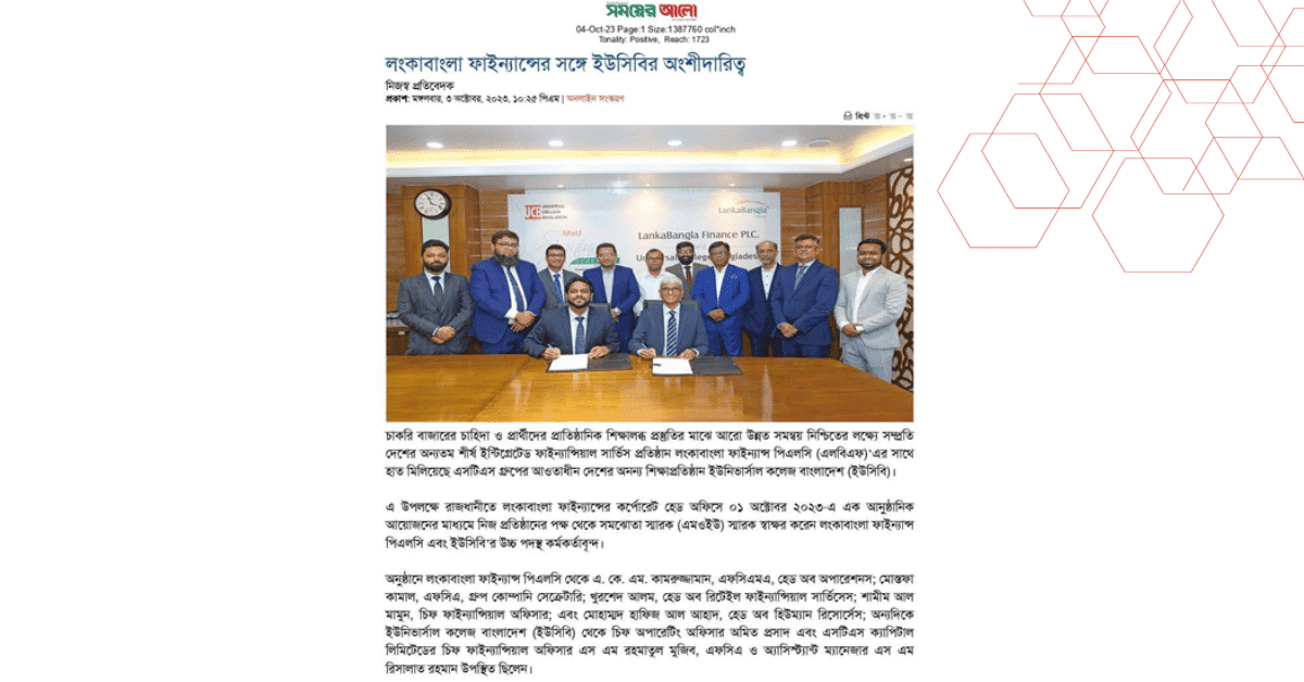 চাকরি বাজারের চাহিদা ও প্রার্থীদের প্রাতিষ্ঠানিক শিক্ষালব্ধ প্রস্তুতির মাঝে আরো উন্নত সমন্বয় নিশ্চিতের লক্ষ্যে সম্প্রতি দেশের অন্যতম শীর্ষ ইন্টিগ্রেটেড ফাইন্যান্সিয়াল সার্ভিস প্রতিষ্ঠান লংকাবাংলা ফাইন্যান্স পিএলসি (এলবিএফ)’এর সাথে হাত মিলিয়েছে এসটিএস গ্রুপের আওতাধীন দেশের অনন্য শিক্ষাপ্রতিষ্ঠান ইউনিভার্সাল কলেজ বাংলাদেশ (ইউসিবি)।