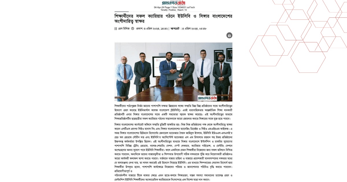 শিক্ষার্থীদের পাঠ্যপুস্তক নির্ভর জ্ঞানের পাশাপাশি দক্ষতা উন্নয়নের লক্ষ্যে সম্প্রতি ভিন্ন ভিন্ন প্রতিষ্ঠানের সাথে অংশীদারিত্বের উদ্যোগ গ্রহণ করেছে ইউনিভার্সাল কলেজ বাংলাদেশ [ইউসিবি]। এরই ধারাবাহিকতায় আন্তর্জাতিক শিক্ষা দানকারী প্রতিষ্ঠানটি এবার সিঙ্গার বাংলাদেশের সাথে একটি সমঝোতা স্মারক স্বাক্ষর করেছে। এই অংশীদারিত্বের মাধ্যমে শিক্ষাপ্রতিষ্ঠানটির ছাত্রছাত্রীরা সফল ক্যারিয়ার গঠনের সম্ভাবনাকে আরো জোরদার করতে সিঙ্গারের সাথে যুক্ত হতে পারবে।