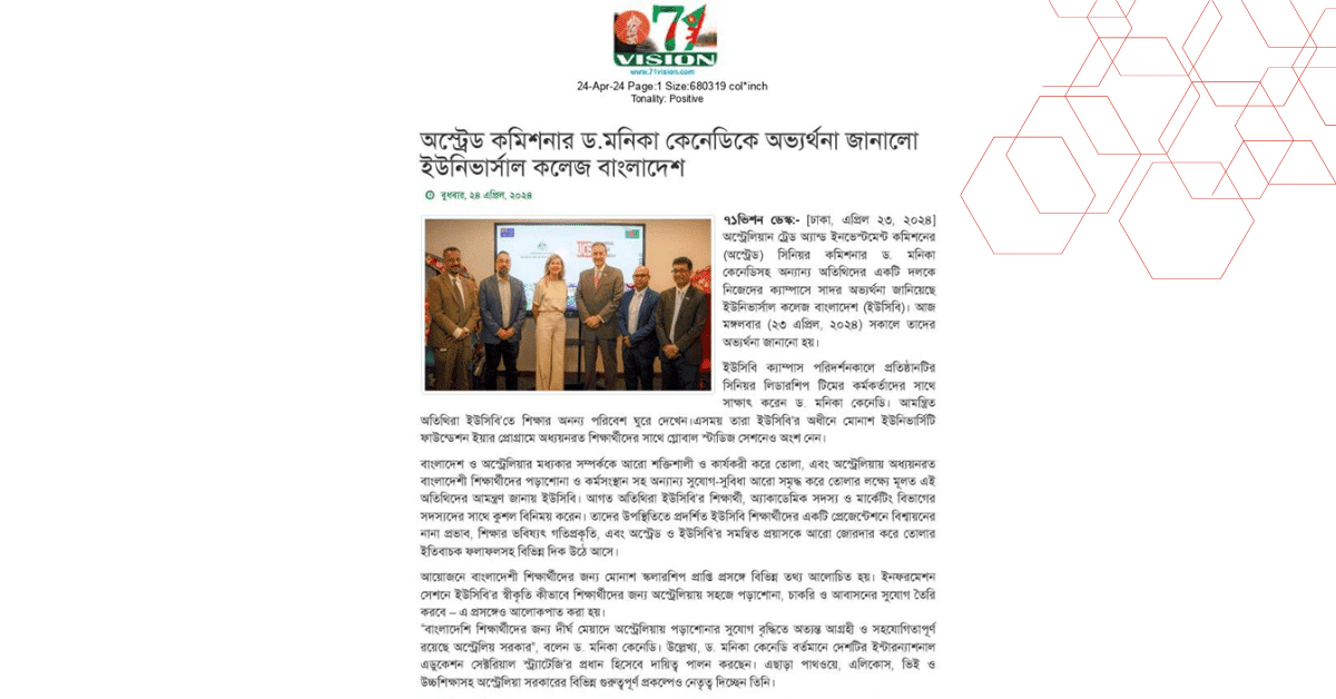 অস্ট্রেলিয়ান ট্রেড অ্যান্ড ইনভেস্টমেন্ট কমিশনের (অস্ট্রেড) সিনিয়র কমিশনার ড. মনিকা কেনেডিসহ অন্যান্য অতিথিদের একটি দলকে নিজেদের ক্যাম্পাসে সাদর অভ্যর্থনা জানিয়েছে ইউনিভার্সাল কলেজ বাংলাদেশ (ইউসিবি)। আজ মঙ্গলবার (২৩ এপ্রিল, ২০২৪) সকালে তাদের অভ্যর্থনা জানানো হয়।