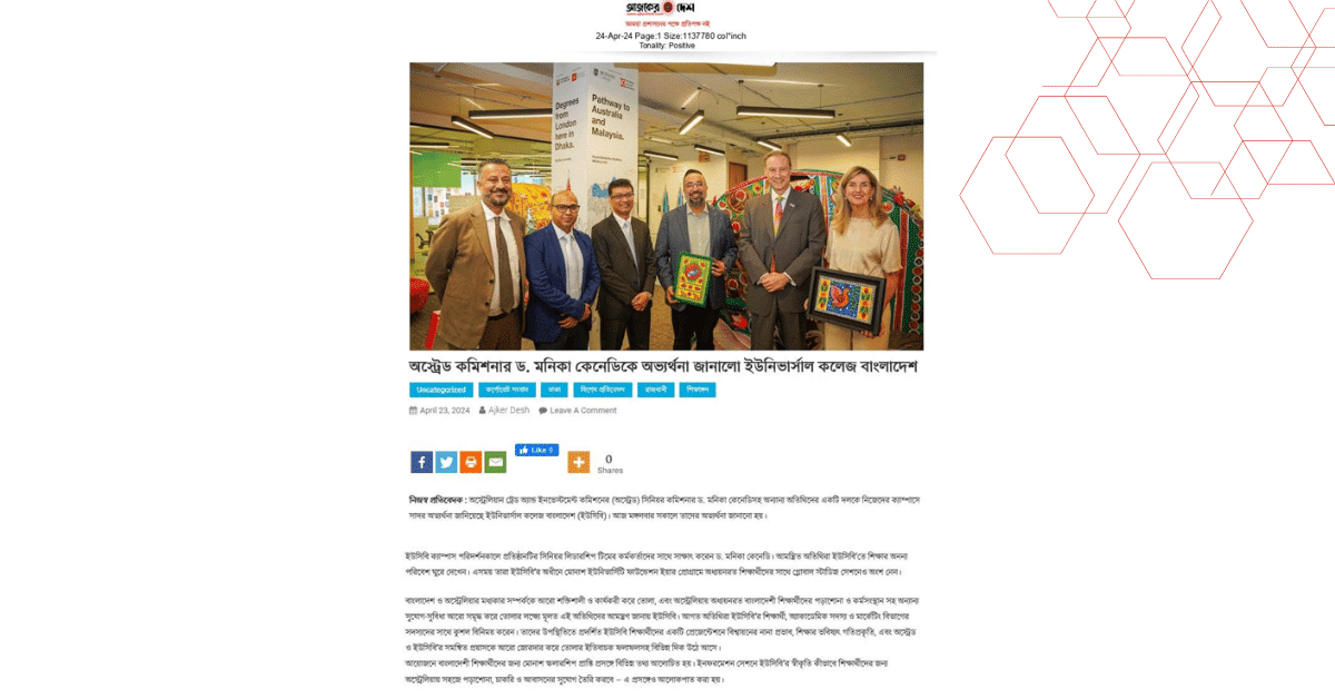 অস্ট্রেলিয়ান ট্রেড অ্যান্ড ইনভেস্টমেন্ট কমিশনের (অস্ট্রেড) সিনিয়র কমিশনার ড. মনিকা কেনেডিসহ অন্যান্য অতিথিদের একটি দলকে নিজেদের ক্যাম্পাসে সাদর অভ্যর্থনা জানিয়েছে ইউনিভার্সাল কলেজ বাংলাদেশ (ইউসিবি)। আজ মঙ্গলবার সকালে তাদের অভ্যর্থনা জানানো হয়।