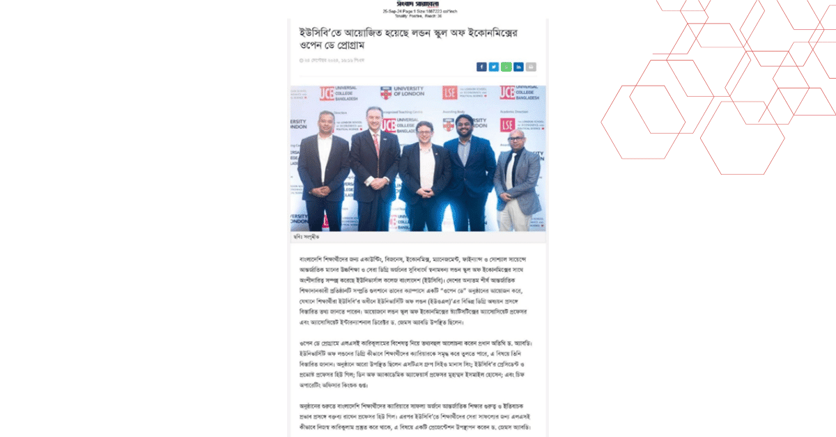 বাংলাদেশি শিক্ষার্থীদের জন্য একাউন্টিং, বিজনেস, ইকোনমিক্স, ম্যানেজমেন্ট, ফাইন্যান্স ও সোশ্যাল সায়েন্সে আন্তর্জাতিক মানের উচ্চশিক্ষা ও সেরা ডিগ্রি অর্জনের সুবিধার্থে স্বনামধন্য লন্ডন স্কুল অফ ইকোনমিক্সের সাথে অংশীদারিত্ব সম্পন্ন করেছে ইউনিভার্সাল কলেজ বাংলাদেশ (ইউসিবি)। দেশের অন্যতম শীর্ষ আন্তর্জাতিক শিক্ষাদানকারী প্রতিষ্ঠানটি সম্প্রতি গুলশানে তাদের ক্যাম্পাসে একটি “ওপেন ডে” অনুষ্ঠানের আয়োজন করে, যেখানে শিক্ষার্থীরা ইউসিবি’র অধীনে ইউনিভার্সিটি অফ লন্ডন (ইউওএল)’এর বিভিন্ন ডিগ্রি অধ্যয়ন প্রসঙ্গে বিস্তারিত তথ্য জানতে পারেন। আয়োজনে লন্ডন স্কুল অফ ইকোনমিক্সের স্ট্যাটিসটিক্সের অ্যাসোসিয়েট প্রফেসর এবং অ্যাসোসিয়েট ইন্টারন্যাশনাল ডিরেক্টর ড. জেমস অ্যাবডি উপস্থিত ছিলেন।