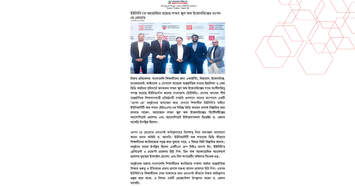 বাংলাদেশি শিক্ষার্থীদের জন্য একাউন্টিং, বিজনেস, ইকোনমিক্স, ম্যানেজমেন্ট, ফাইন্যান্স ও সোশ্যাল সায়েন্সে আন্তর্জাতিক মানের উচ্চশিক্ষা ও সেরা ডিগ্রি অর্জনের সুবিধার্থে স্বনামধন্য লন্ডন স্কুল অফ ইকোনমিক্সের সাথে অংশীদারিত্ব সম্পন্ন করেছে ইউনিভার্সাল কলেজ বাংলাদেশ (ইউসিবি)। দেশের অন্যতম শীর্ষ আন্তর্জাতিক শিক্ষাদানকারী প্রতিষ্ঠানটি সম্প্রতি গুলশানে তাদের ক্যাম্পাসে একটি “ওপেন ডে” অনুষ্ঠানের আয়োজন করে, যেখানে শিক্ষার্থীরা ইউসিবি’র অধীনে ইউনিভার্সিটি অফ লন্ডন (ইউওএল)’এর বিভিন্ন ডিগ্রি অধ্যয়ন প্রসঙ্গে বিস্তারিত তথ্য জানতে পারেন। আয়োজনে লন্ডন স্কুল অফ ইকোনমিক্সের স্ট্যাটিসটিক্সের অ্যাসোসিয়েট প্রফেসর এবং অ্যাসোসিয়েট ইন্টারন্যাশনাল ডিরেক্টর ড. জেমস অ্যাবডি উপস্থিত ছিলেন।