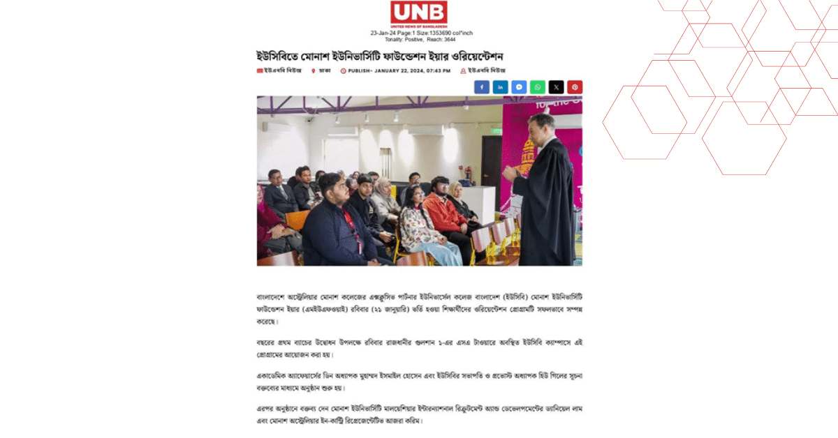 বাংলাদেশে অস্ট্রেলিয়ার মোনাশ কলেজের এক্সক্লুসিভ পার্টনার ইউনিভার্সেল কলেজ বাংলাদেশ (ইউসিবি) মোনাশ ইউনিভার্সিটি ফাউন্ডেশন ইয়ার (এমইউএফওয়াই) রবিবার (২১ জানুয়ারি) ভর্তি হওয়া শিক্ষার্থীদের ওরিয়েন্টেশন প্রোগ্রামটি সফলভাবে সম্পন্ন করেছে।
