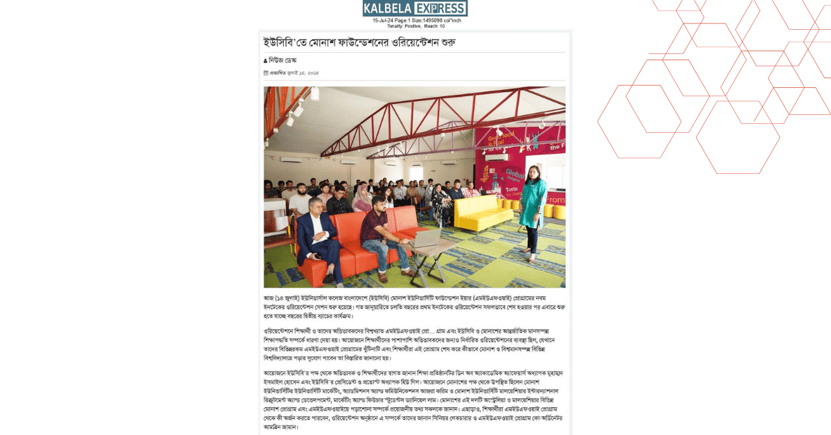 আয়োজনে ইউসিবি’র পক্ষ থেকে অভিভাবক ও শিক্ষার্থীদের স্বাগত জানান শিক্ষা প্রতিষ্ঠানটির ডিন অব অ্যাকাডেমিক অ্যাফেয়ার্স অধ্যাপক মুহাম্মদ ইসমাইল হোসেন এবং ইউসিবি’র প্রেসিডেন্ট ও প্রভোস্ট অধ্যাপক হিউ গিল। আয়োজনে মোনাশের পক্ষ থেকে উপস্থিত ছিলেন মোনাশ ইউনিভার্সিটির ইউনিভার্সিটি মার্কেটিং, অ্যাডমিশনস অ্যান্ড কমিউনিকেশনস আজরা করিম ও মোনাশ ইউনিভার্সিটি মালয়েশিয়ার ইন্টারন্যাশনাল রিক্রুটমেন্ট অ্যান্ড ডেভেলপমেন্ট, মার্কেটিং অ্যান্ড ফিউচার স্টুডেন্টস ড্যানিয়েল লাম। মোনাশের এই দলটি অস্ট্রেলিয়া ও মালয়েশিয়ার বিভিন্ন মোনাশ প্রোগ্রাম এবং এমইউএফওয়াইয়ে পড়াশোনা সম্পর্কে প্রয়োজনীয় তথ্য সকলকে জানান। এছাড়াও, শিক্ষার্থীরা এমইউএফওয়াই প্রোগ্রাম থেকে কী অর্জন করতে পারবেন, ওরিয়েন্টেশন অনুষ্ঠানে এ সম্পর্কে তাদের জানান সিনিয়র লেকচারার ও এমইউএফওয়াই প্রোগ্রাম কো-অর্ডিনেটর আমব্রিন জামান।