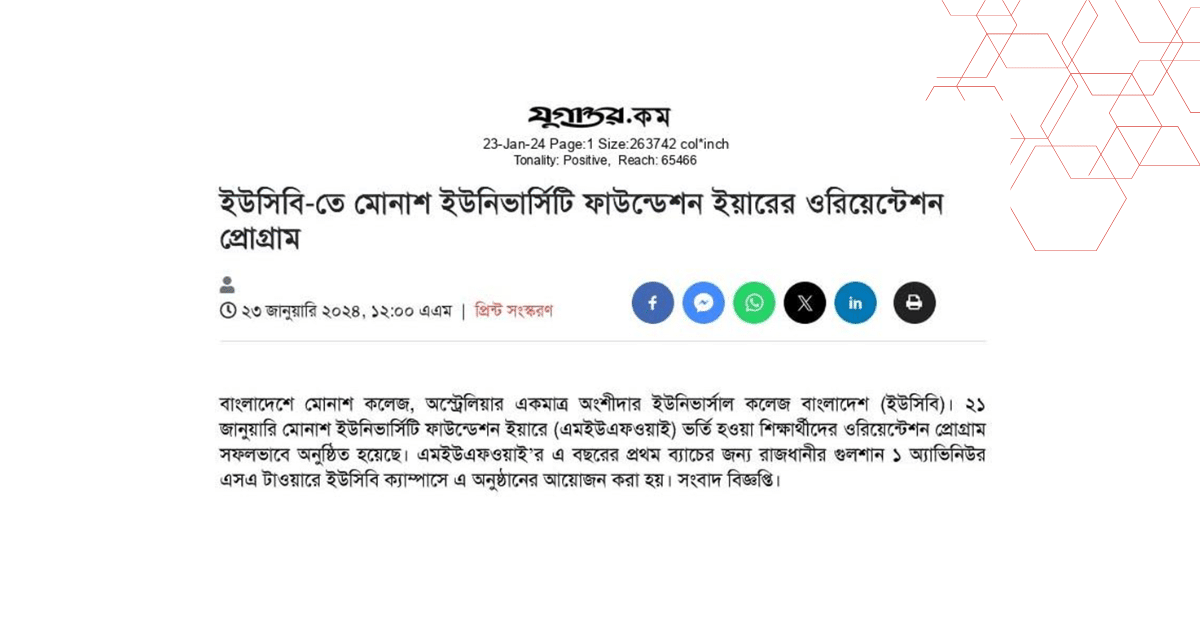 বাংলাদেশে মোনাশ কলেজ, অস্ট্রেলিয়ার একমাত্র অংশীদার ইউনিভার্সাল কলেজ বাংলাদেশ (ইউসিবি)। ২১ জানুয়ারি মোনাশ ইউনিভার্সিটি ফাউন্ডেশন ইয়ারে (এমইউএফওয়াই) ভর্তি হওয়া শিক্ষার্থীদের ওরিয়েন্টেশন প্রোগ্রাম সফলভাবে অনুষ্ঠিত হয়েছে। এমইউএফওয়াই’র এ বছরের প্রথম ব্যাচের জন্য রাজধানীর গুলশান ১ অ্যাভিনিউর এসএ টাওয়ারে ইউসিবি ক্যাম্পাসে এ অনুষ্ঠানের আয়োজন করা হয়। সংবাদ বিজ্ঞপ্তি।