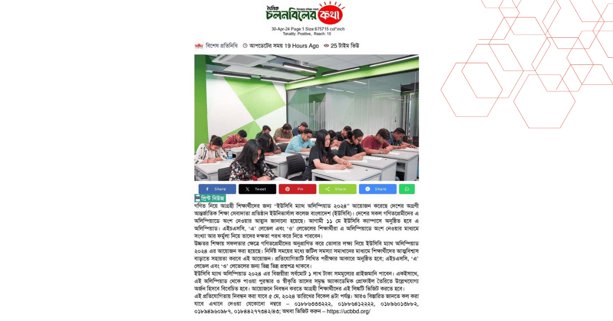 গণিত নিয়ে আগ্রহী শিক্ষার্থীদের জন্য “ইউসিবি ম্যাথ অলিম্পিয়াড ২০২৪” আয়োজন করেছে দেশের অগ্রণী আন্তর্জাতিক শিক্ষা সেবাদাতা প্রতিষ্ঠান ইউনিভার্সাল কলেজ বাংলাদেশ (ইউসিবি)। দেশের সকল গণিতপ্রেমীদের এ অলিম্পিয়াডে অংশ নেওয়ার আহ্বান জানানো হয়েছে। আগামী ১১ মে ইউসিবি ক্যাম্পাসে অনুষ্ঠিত হবে এ অলিম্পিয়াড। এইচএসসি, ‘এ’ লেভেল এবং ‘ও’ লেভেলের শিক্ষার্থীরা এ অলিম্পিয়াডে অংশ নেওয়ার মাধ্যমে সংখ্যা আর ফর্মুলা নিয়ে তাদের দক্ষতা পরখ করে নিতে পারবেন।