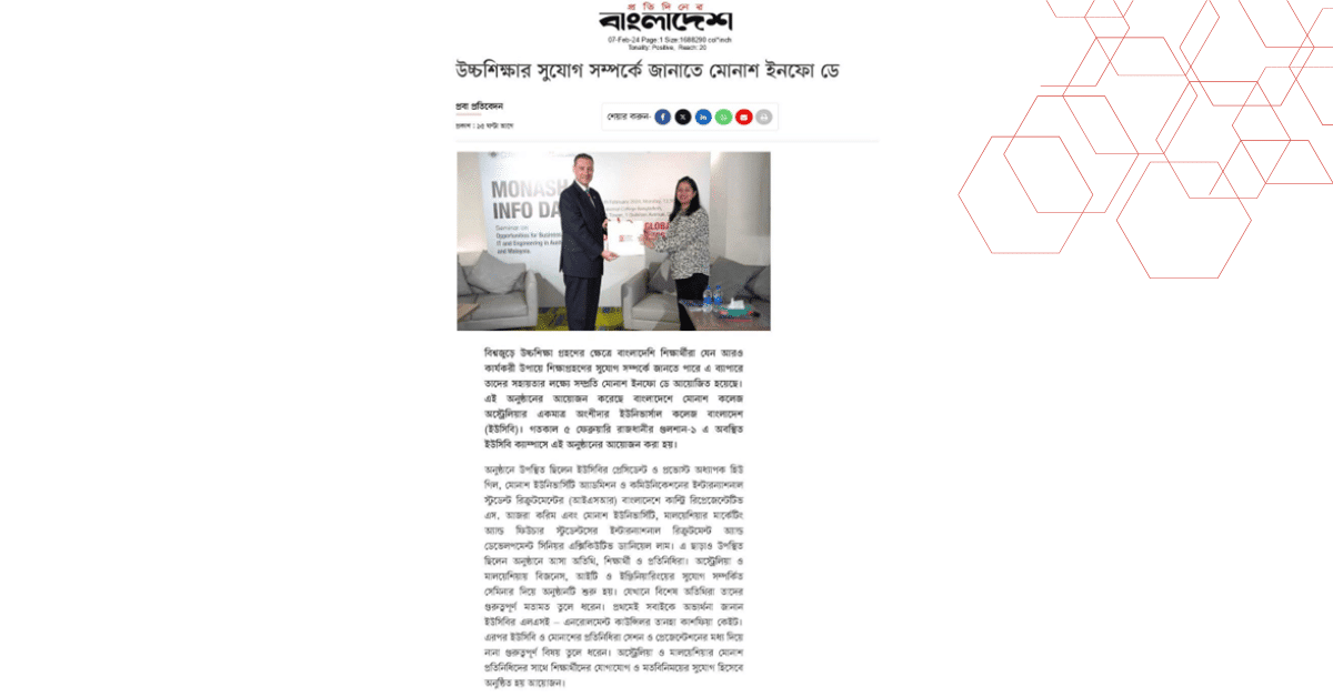 বিশ্বজুড়ে উচ্চশিক্ষা গ্রহণের ক্ষেত্রে বাংলাদেশি শিক্ষার্থীরা যেন আরও কার্যকরী উপায়ে শিক্ষাগ্রহণের সুযোগ সম্পর্কে জানতে পারে এ ব্যাপারে তাদের সহায়তার লক্ষ্যে সম্প্রতি মোনাশ ইনফো ডে আয়োজিত হয়েছে। এই অনুষ্ঠানের আয়োজন করেছে বাংলাদেশে মোনাশ কলেজ অস্ট্রেলিয়ার একমাত্র অংশীদার ইউনিভার্সাল কলেজ বাংলাদেশ (ইউসিবি)। গতকাল ৫ ফেব্রুয়ারি রাজধানীর গুলশান-১ এ অবস্থিত ইউসিবি ক্যাম্পাসে এই অনুষ্ঠানের আয়োজন করা হয়।