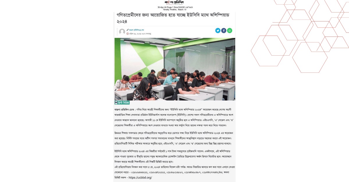 গণিত নিয়ে আগ্রহী শিক্ষার্থীদের জন্য “ইউসিবি ম্যাথ অলিম্পিয়াড ২০২৪” আয়োজন করেছে দেশের অগ্রণী আন্তর্জাতিক শিক্ষা সেবাদাতা প্রতিষ্ঠান ইউনিভার্সাল কলেজ বাংলাদেশ (ইউসিবি)। দেশের সকল গণিতপ্রেমীদের এ অলিম্পিয়াডে অংশ নেওয়ার আহ্বান জানানো হয়েছে। আগামী ১১ মে ইউসিবি ক্যাম্পাসে অনুষ্ঠিত হবে এ অলিম্পিয়াড। এইচএসসি, ‘এ’ লেভেল এবং ‘ও’ লেভেলের শিক্ষার্থীরা এ অলিম্পিয়াডে অংশ নেওয়ার মাধ্যমে সংখ্যা আর ফর্মুলা নিয়ে তাদের দক্ষতা পরখ করে নিতে পারবেন।