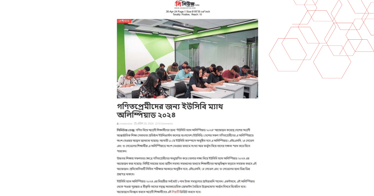 গণিত নিয়ে আগ্রহী শিক্ষার্থীদের জন্য “ইউসিবি ম্যাথ অলিম্পিয়াড ২০২৪” আয়োজন করেছে দেশের অগ্রণী আন্তর্জাতিক শিক্ষা সেবাদাতা প্রতিষ্ঠান ইউনিভার্সাল কলেজ বাংলাদেশ (ইউসিবি)। দেশের সকল গণিতপ্রেমীদের এ অলিম্পিয়াডে অংশ নেওয়ার আহ্বান জানানো হয়েছে। আগামী ১১ মে ইউসিবি ক্যাম্পাসে অনুষ্ঠিত হবে এ অলিম্পিয়াড। এইচএসসি, ‘এ’ লেভেল এবং ‘ও’ লেভেলের শিক্ষার্থীরা এ অলিম্পিয়াডে অংশ নেওয়ার মাধ্যমে সংখ্যা আর ফর্মুলা নিয়ে তাদের দক্ষতা পরখ করে নিতে পারবেন।