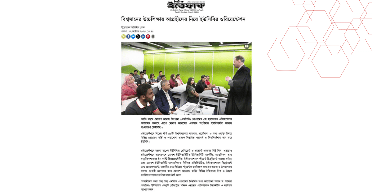 চলতি বছরে মোনাশ কলেজ ডিপ্লোমা (এমসিডি) প্রোগ্রামের ৩য় ইনটেকের ওরিয়েন্টেশন আয়োজন করেছে দেশে মোনাশ কলেজের একমাত্র অংশীদার ইউনিভার্সাল কলেজ বাংলাদেশ (ইউসিবি)।