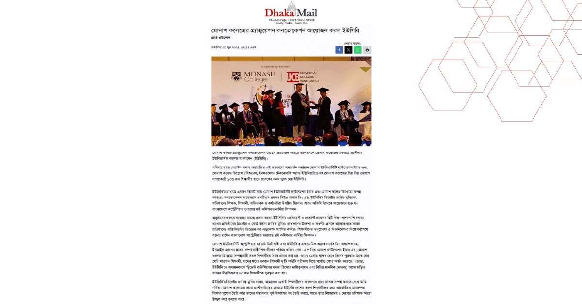 মোনাশ কলেজ গ্র্যাজুয়েশন কনভোকেশন-২০২৪ আয়োজন করেছে বাংলাদেশে মোনাশ কলেজের একমাত্র অংশীদার ইউনিভার্সাল কলেজ বাংলাদেশ (ইউসিবি)।