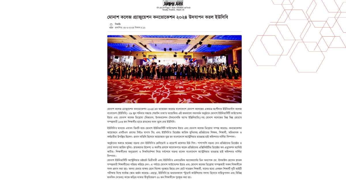 মোনাশ কলেজ গ্র্যাজুয়েশন কনভোকেশন ২০২৪’এর আয়োজন করেছে বাংলাদেশে মোনাশ কলেজের একমাত্র অংশীদার ইউনিভার্সাল কলেজ বাংলাদেশ (ইউসিবি)। ২৯ জুন শনিবার সন্ধ্যায় শেরাটন ঢাকা’য় আয়োজিত এই জমকালো সমাবর্তন অনুষ্ঠানে মোনাশ ইউনিভার্সিটি ফাউন্ডেশন ইয়ার এবং মোনাশ কলেজ ডিপ্লোমা (বিজনেস, ইনফরমেশন টেকনোলজি অ্যান্ড ইঞ্জিনিয়ারিং)-সহ মোনাশ কলেজের ভিন্ন ভিন্ন প্রোগ্রাম সম্পন্নকারী ১০৩ জন শিক্ষার্থীর হাতে স্নাতকের সনদ তুলে দেয় ইউসিবি।