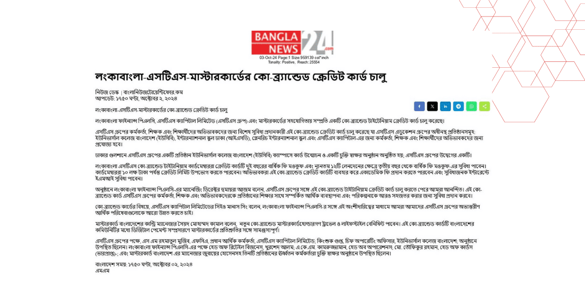 এসটিএস গ্রুপের কর্মকর্তা, শিক্ষক এবং শিক্ষার্থীদের অভিভাবকদের জন্য বিশেষ সুবিধা প্রদানকারী এই কো-ব্র্যান্ডেড ক্রেডিট কার্ড চালু করেছে যা এসটিএস এডুকেশন গ্রুপের অধীনস্থ প্রতিষ্ঠানসমূহ: ইউনিভার্সাল কলেজ বাংলাদেশ (ইউসিবি), ইন্টারন্যাশনাল স্কুল ঢাকা (আইএসডি), গ্লেনরিচ ইন্টারন্যাশনাল স্কুল এবং এসটিএস ক্যাপিটাল-এর জন্য কর্মকর্তা, শিক্ষক এবং শিক্ষার্থীদের অভিভাবকদের জন্য প্রযোজ্য হবে।