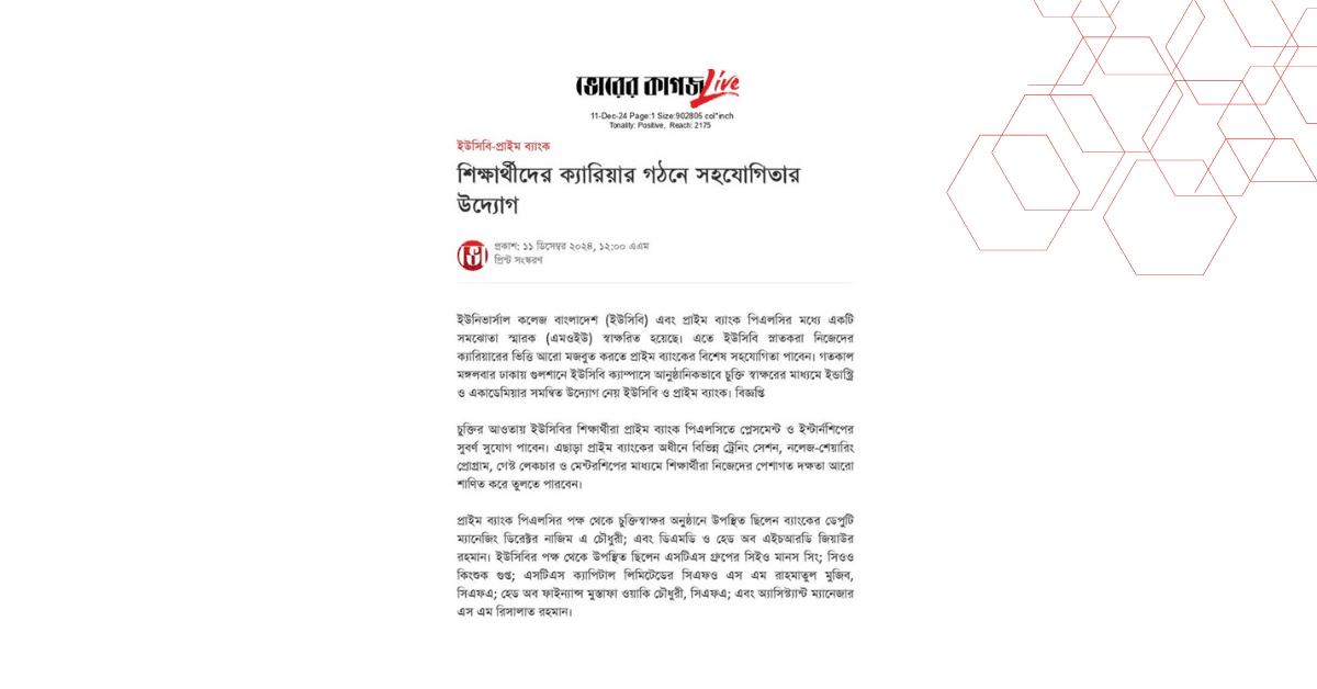 চুক্তির আওতায় ইউসিবির শিক্ষার্থীরা প্রাইম ব্যাংক পিএলসিতে প্লেসমেন্ট ও ইন্টার্নশিপের সুবর্ণ সুযোগ পাবেন। এছাড়া প্রাইম ব্যাংকের অধীনে বিভিন্ন ট্রেনিং সেশন, নলেজ-শেয়ারিং প্রোগ্রাম, গেস্ট লেকচার ও মেন্টরশিপের মাধ্যমে শিক্ষার্থীরা নিজেদের পেশাগত দক্ষতা আরো শাণিত করে তুলতে পারবেন।