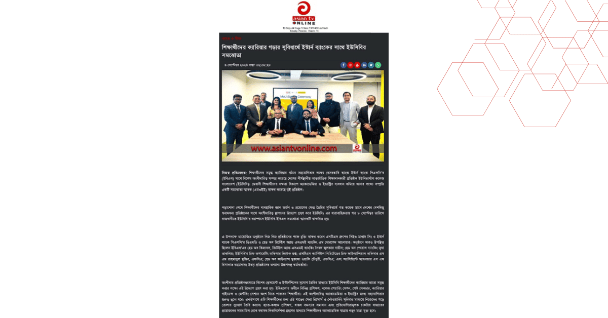 শিক্ষার্থীদের সমৃদ্ধ ক্যারিয়ার গঠনে সহযোগিতার লক্ষ্যে বেসরকারি ব্যাংক ইস্টার্ন ব্যাংক পিএলসি’র (ইবিএল) সাথে বিশেষ অংশীদারিত্ব সম্পন্ন করেছে দেশের শীর্ষস্থানীয় আন্তর্জাতিক শিক্ষাদানকারী প্রতিষ্ঠান ইউনিভার্সাল কলেজ বাংলাদেশ (ইউসিবি)। মেধাবী শিক্ষার্থীদের দক্ষতা বিকাশে অ্যাকাডেমিয়া ও ইন্ডাস্ট্রির ব্যবধান কমিয়ে আনার লক্ষ্যে সম্প্রতি একটি সমঝোতা স্মারক (এমওইউ) স্বাক্ষর করেছে দুই প্রতিষ্ঠান।