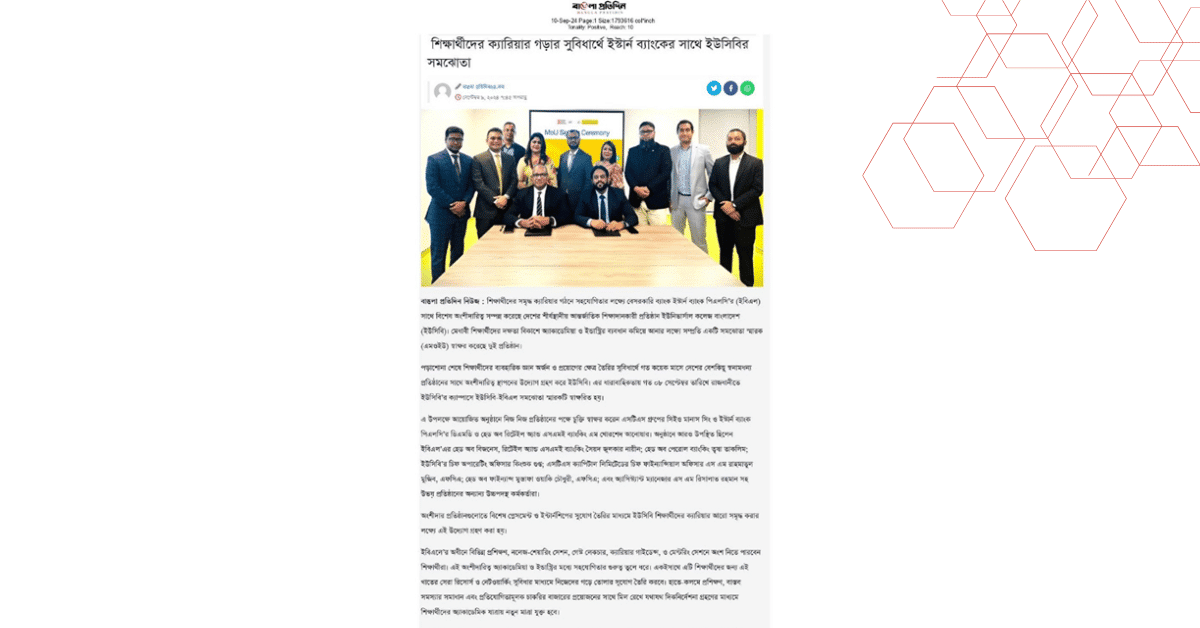 শিক্ষার্থীদের সমৃদ্ধ ক্যারিয়ার গঠনে সহযোগিতার লক্ষ্যে বেসরকারি ব্যাংক ইস্টার্ন ব্যাংক পিএলসি’র (ইবিএল) সাথে বিশেষ অংশীদারিত্ব সম্পন্ন করেছে দেশের শীর্ষস্থানীয় আন্তর্জাতিক শিক্ষাদানকারী প্রতিষ্ঠান ইউনিভার্সাল কলেজ বাংলাদেশ (ইউসিবি)। মেধাবী শিক্ষার্থীদের দক্ষতা বিকাশে অ্যাকাডেমিয়া ও ইন্ডাস্ট্রির ব্যবধান কমিয়ে আনার লক্ষ্যে সম্প্রতি একটি সমঝোতা স্মারক (এমওইউ) স্বাক্ষর করেছে দুই প্রতিষ্ঠান।