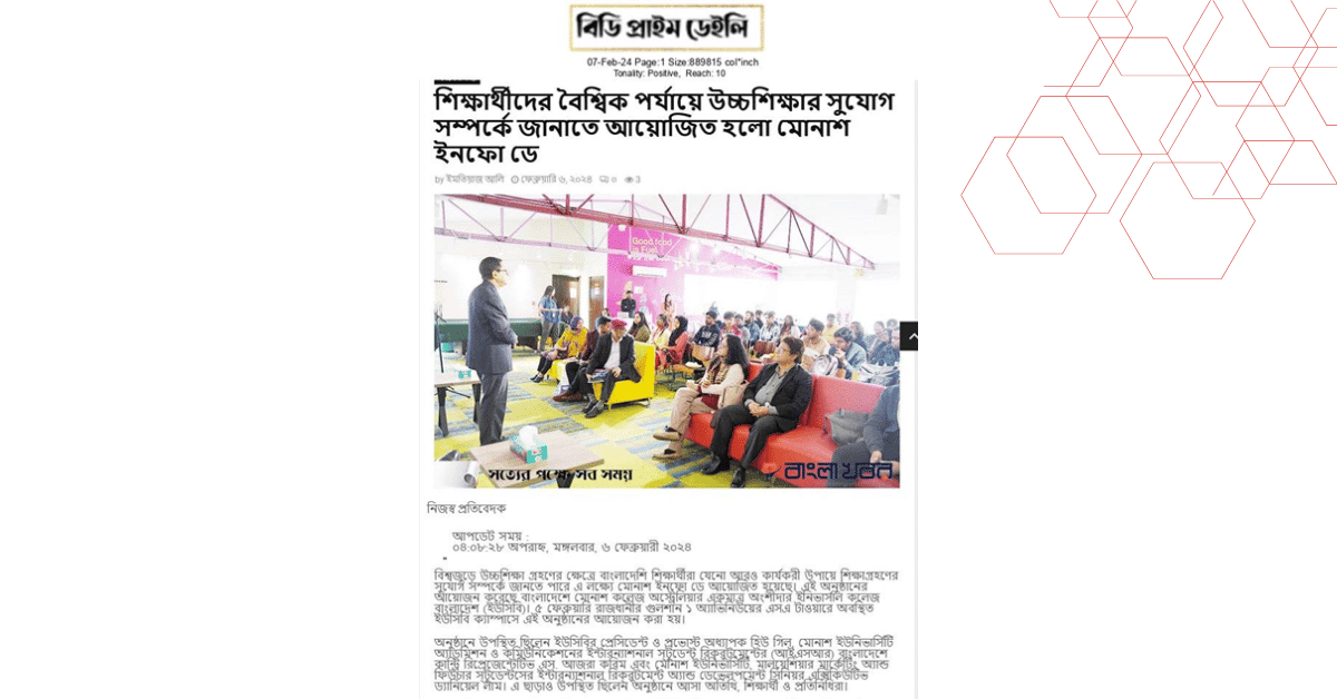 বিশ্বজুড়ে উচ্চশিক্ষা গ্রহণের ক্ষেত্রে বাংলাদেশি শিক্ষার্থীরা যেনো আরও কার্যকরী উপায়ে শিক্ষাগ্রহণের সুযোগ সম্পর্কে জানতে পারে এ লক্ষ্যে মোনাশ ইনফো ডে আয়োজিত হয়েছে। এই অনুষ্ঠানের আয়োজন করেছে বাংলাদেশে মোনাশ কলেজ অস্ট্রেলিয়ার একমাত্র অংশীদার ইনিভার্সাল কলেজ বাংলাদেশ (ইউসিবি)। ৫ ফেব্রুয়ারি রাজধানীর গুলশান ১ অ্যাভিনিউয়ের এসএ টাওয়ারে অবস্থিত ইউসিবি ক্যাম্পাসে এই অনুষ্ঠানের আয়োজন করা হয়।