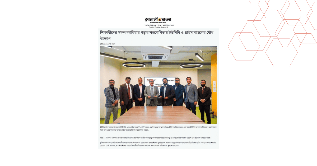 ইউনিভার্সাল কলেজ বাংলাদেশ (ইউসিবি) এবং প্রাইম ব্যাংক পিএলসি’র মধ্যে একটি সমঝোতা স্মারক (এমওইউ) স্বাক্ষরিত হয়েছে। যার ফলে ইউসিবি স্নাতকেরা নিজেদের ক্যারিয়ারের ভিত্তি আরও মজবুত করে তুলতে প্রাইম ব্যাংকের বিশেষ সহযোগিতা পাবেন।