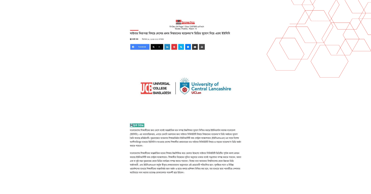 বাংলাদেশের শিক্ষার্থীদের জন্য দেশে বসেই আন্তর্জাতিক মান সম্পন্ন উচ্চশিক্ষার সুযোগ নিশ্চিত করছে ইউনিভার্সাল কলেজ বাংলাদেশ (ইউসিবি)। এর ধারাবাহিকতায়, এবারে মেধাবি তরুণদের জন্য সাইবার সিকিউরিটি বিষয়ে বিশ্বমানের ব্যাচেলর’স ডিগ্রি অর্জনের সুযোগ তৈরি করেছে প্রতিষ্ঠানটি। যুক্তরাজ্যের খ্যাতনামা শিক্ষাপ্রতিষ্ঠান ইউনিভার্সিটি অফ সেন্ট্রাল ল্যাঙ্কাশায়ার (ইউসিএলএএন)’এর সাথে বিশেষ অংশীদারিত্বের মাধ্যমে ইউসিবি’র আওতায় দেশের শিক্ষার্থীরা প্রথমবারের মত সাইবার সিকিউরিটি বিষয়ে ৩ বছরের ব্যাচেলর’স ডিগ্রি অর্জন করতে পারবেন।