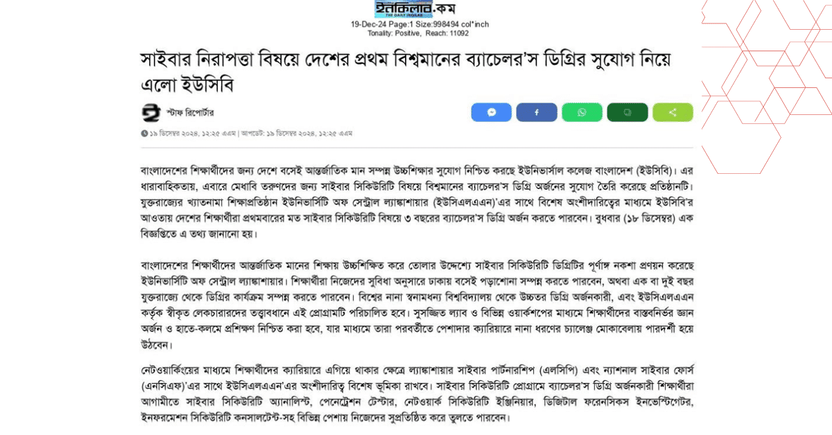 বাংলাদেশের শিক্ষার্থীদের জন্য দেশে বসেই আন্তর্জাতিক মান সম্পন্ন উচ্চশিক্ষার সুযোগ নিশ্চিত করছে ইউনিভার্সাল কলেজ বাংলাদেশ (ইউসিবি)। এর ধারাবাহিকতায়, এবারে মেধাবি তরুণদের জন্য সাইবার সিকিউরিটি বিষয়ে বিশ্বমানের ব্যাচেলর’স ডিগ্রি অর্জনের সুযোগ তৈরি করেছে প্রতিষ্ঠানটি। যুক্তরাজ্যের খ্যাতনামা শিক্ষাপ্রতিষ্ঠান ইউনিভার্সিটি অফ সেন্ট্রাল ল্যাঙ্কাশায়ার (ইউসিএলএএন)’এর সাথে বিশেষ অংশীদারিত্বের মাধ্যমে ইউসিবি’র আওতায় দেশের শিক্ষার্থীরা প্রথমবারের মত সাইবার সিকিউরিটি বিষয়ে ৩ বছরের ব্যাচেলর’স ডিগ্রি অর্জন করতে পারবেন। বুধবার (১৮ ডিসেম্বর) এক বিজ্ঞপ্তিতে এ তথ্য জানানো হয়।