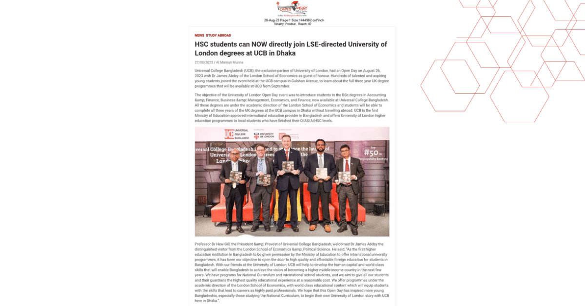 Prof. Dr Muhammad Ismail Hossain, Dean of Academic affairs said, “At UCB, students get the unique opportunity to pursue international higher education at home and to complete their degrees from the University of London while staying in Bangladesh. Bangladeshis from all schools and curriculums now have the golden opportunity to get a world-class UK degree here in Dhaka and I want as many young Bangladeshis as possible to join our amazing programmes.”.